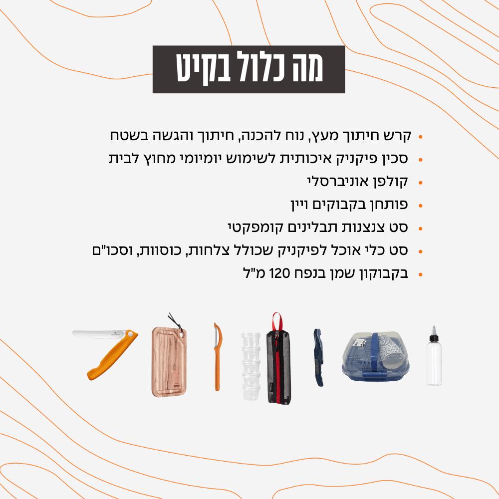 הקיט מיועד להכנת אוכל והגשה בפיקניק ובקמפינג וכולל כלים לחיתוך קילוף תיבול פתיחת בקבוקים והגשת ארוחה מחוץ לבית.